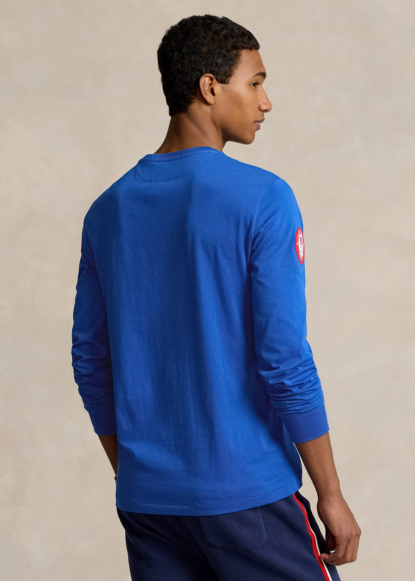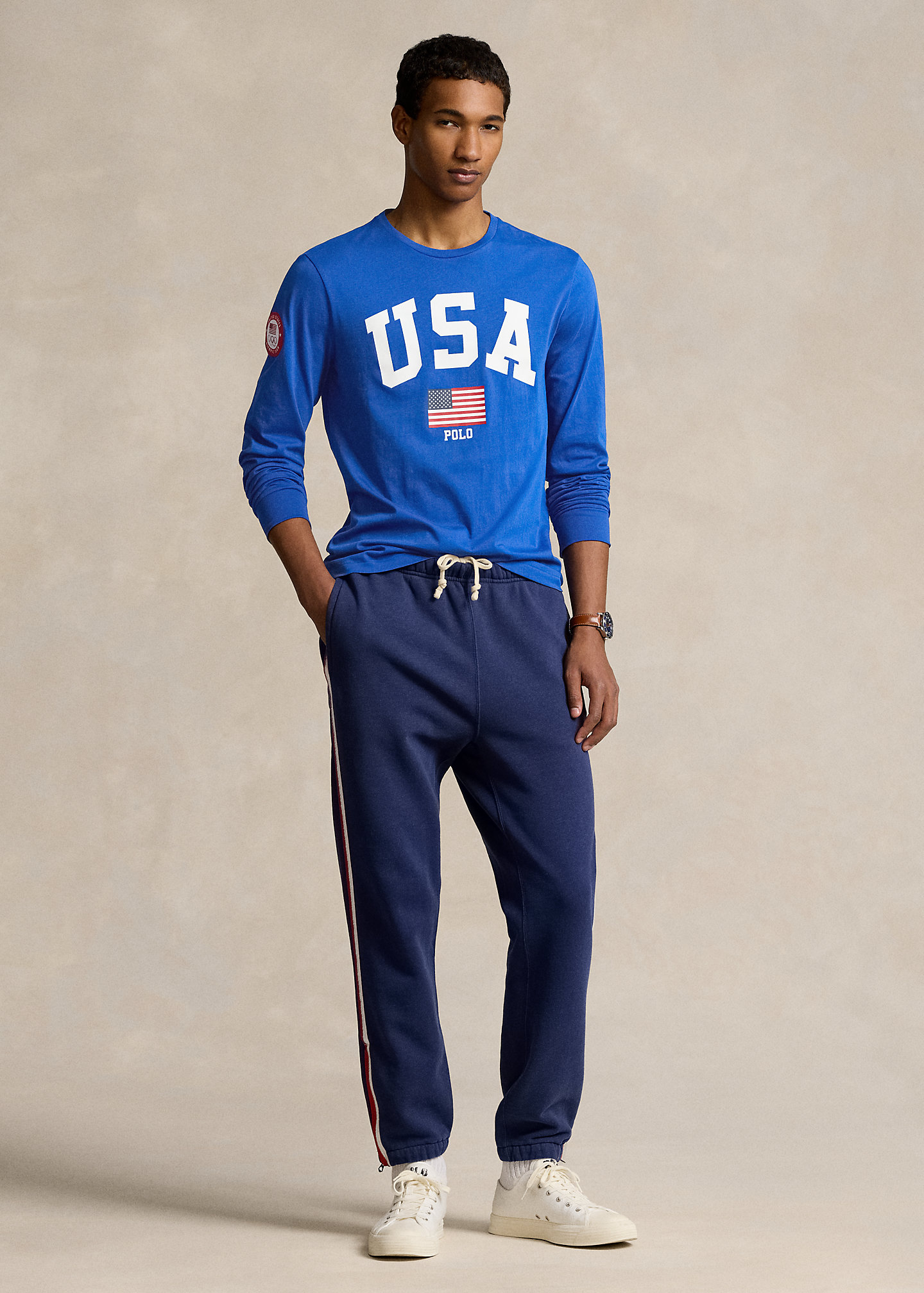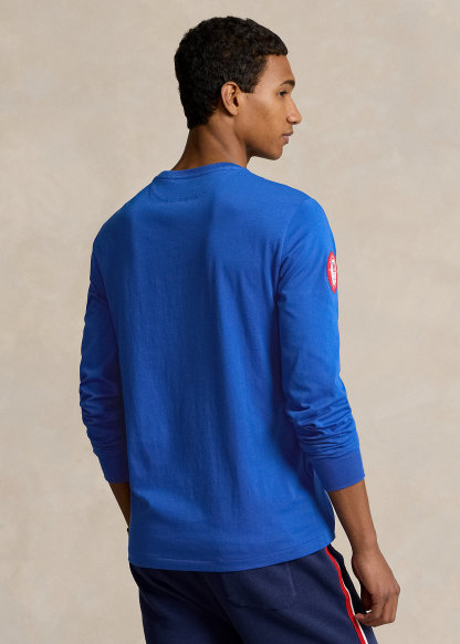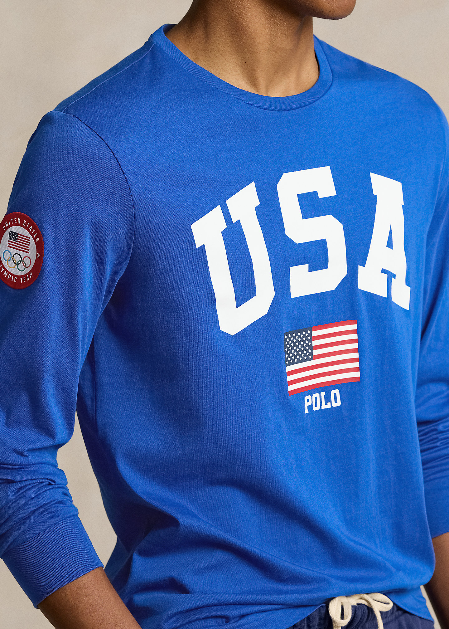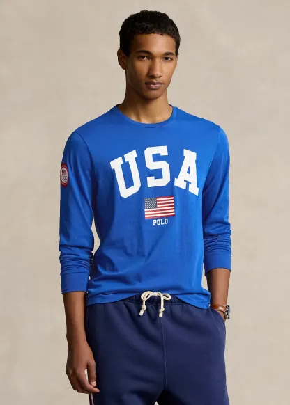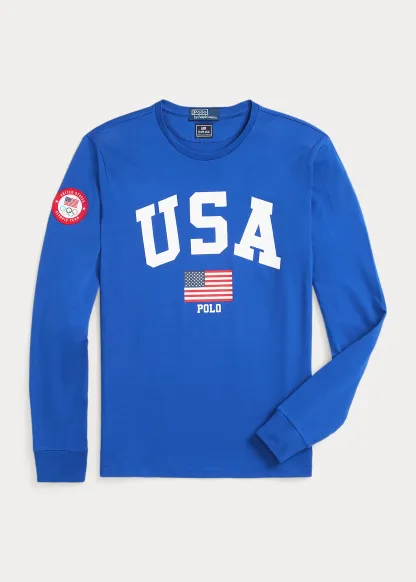 - Crewneck. Long sleeves with ribbed cuffs. Official logo patch of the U.S. Olympic Team at the right sleeve. "USA," an American flag, and "Polo" printed at the center front.