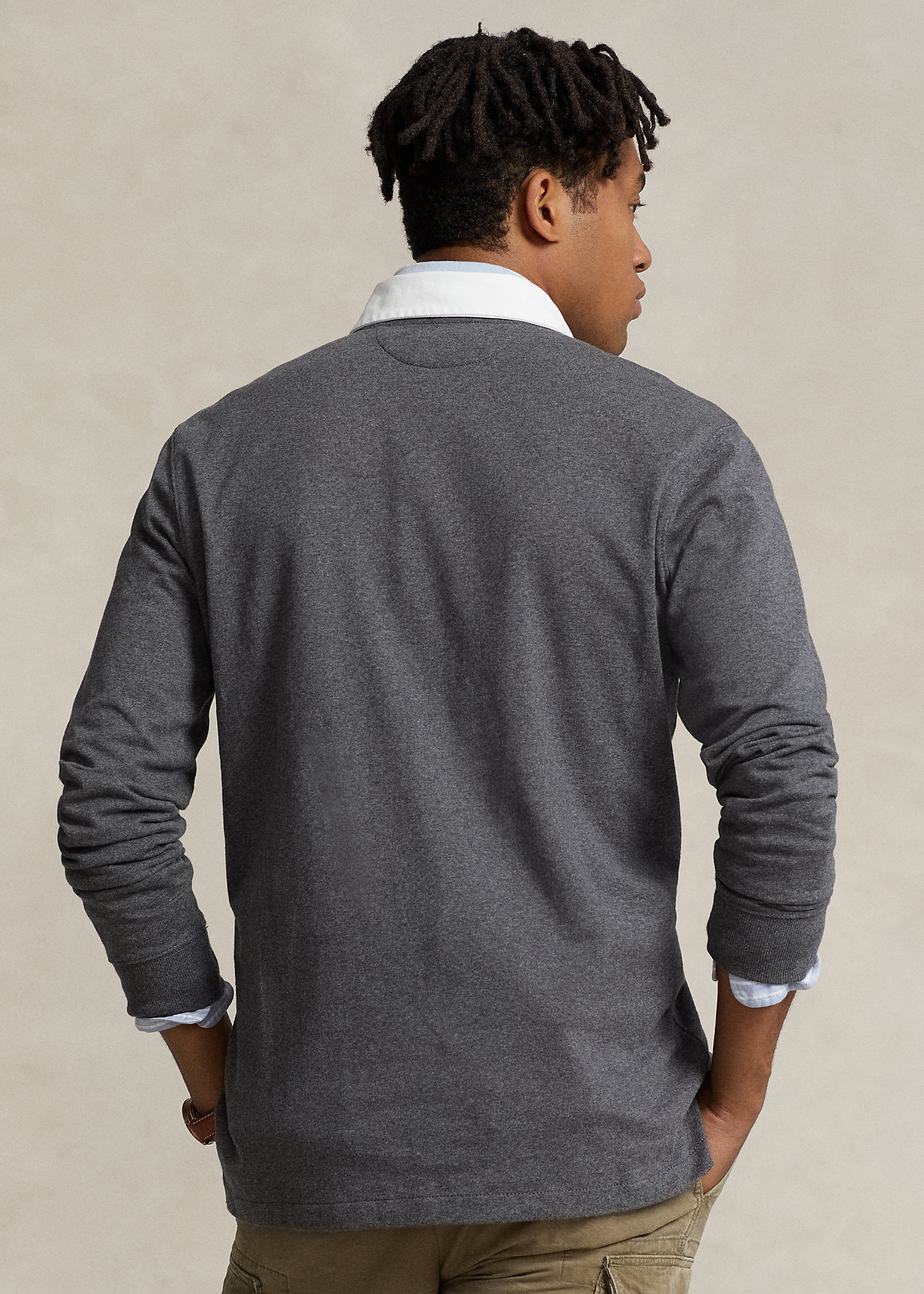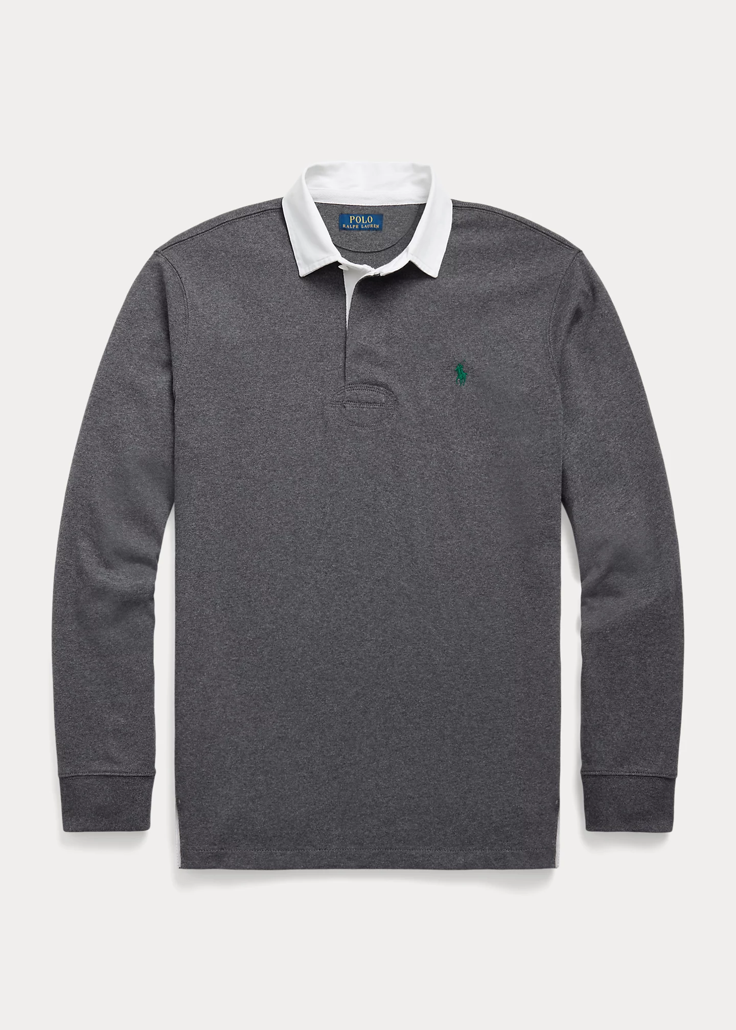 - Twill rugby collar. Three-button placket. Rubber buttons.