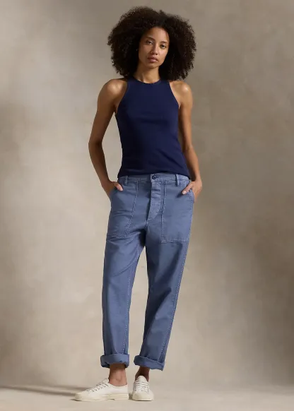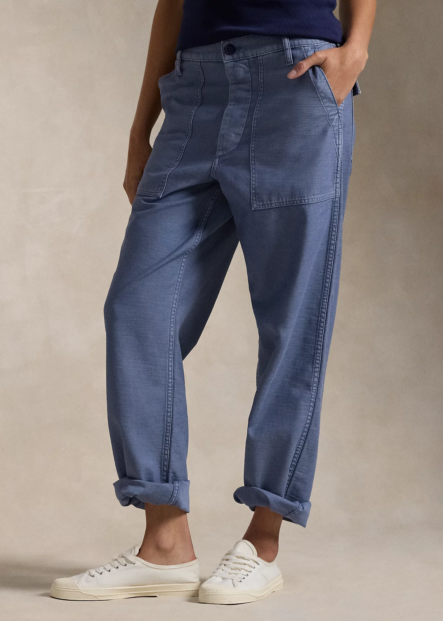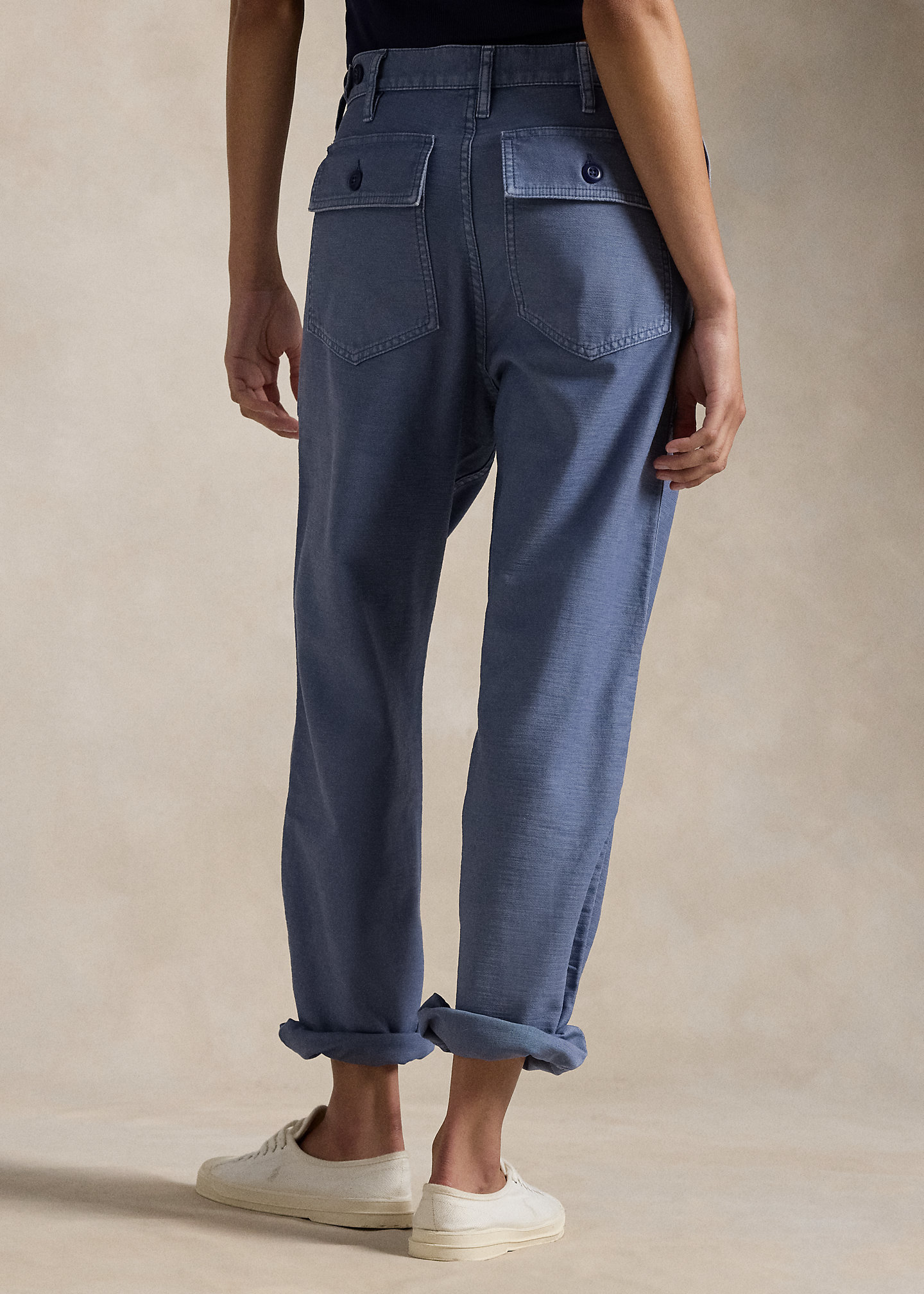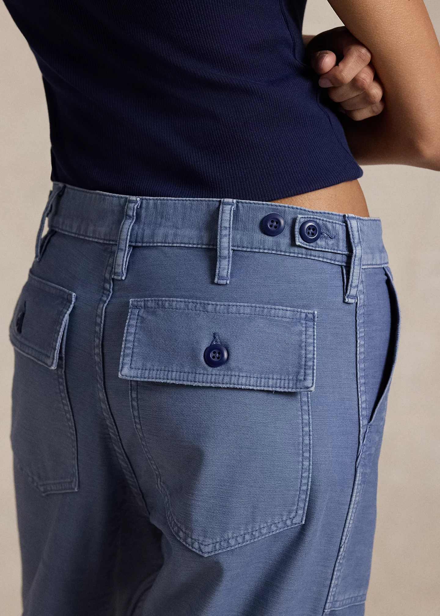 - Belt loops. Buttoned fly with a buttoned closure. Adjustable buttoned tabs at each side.