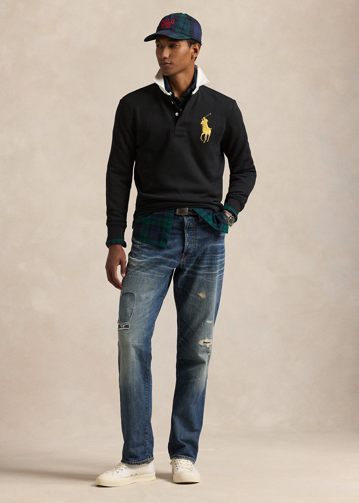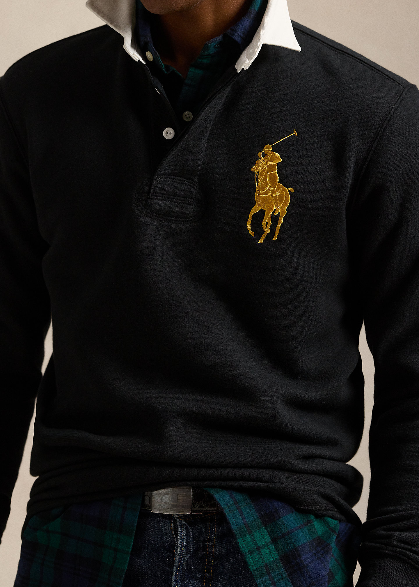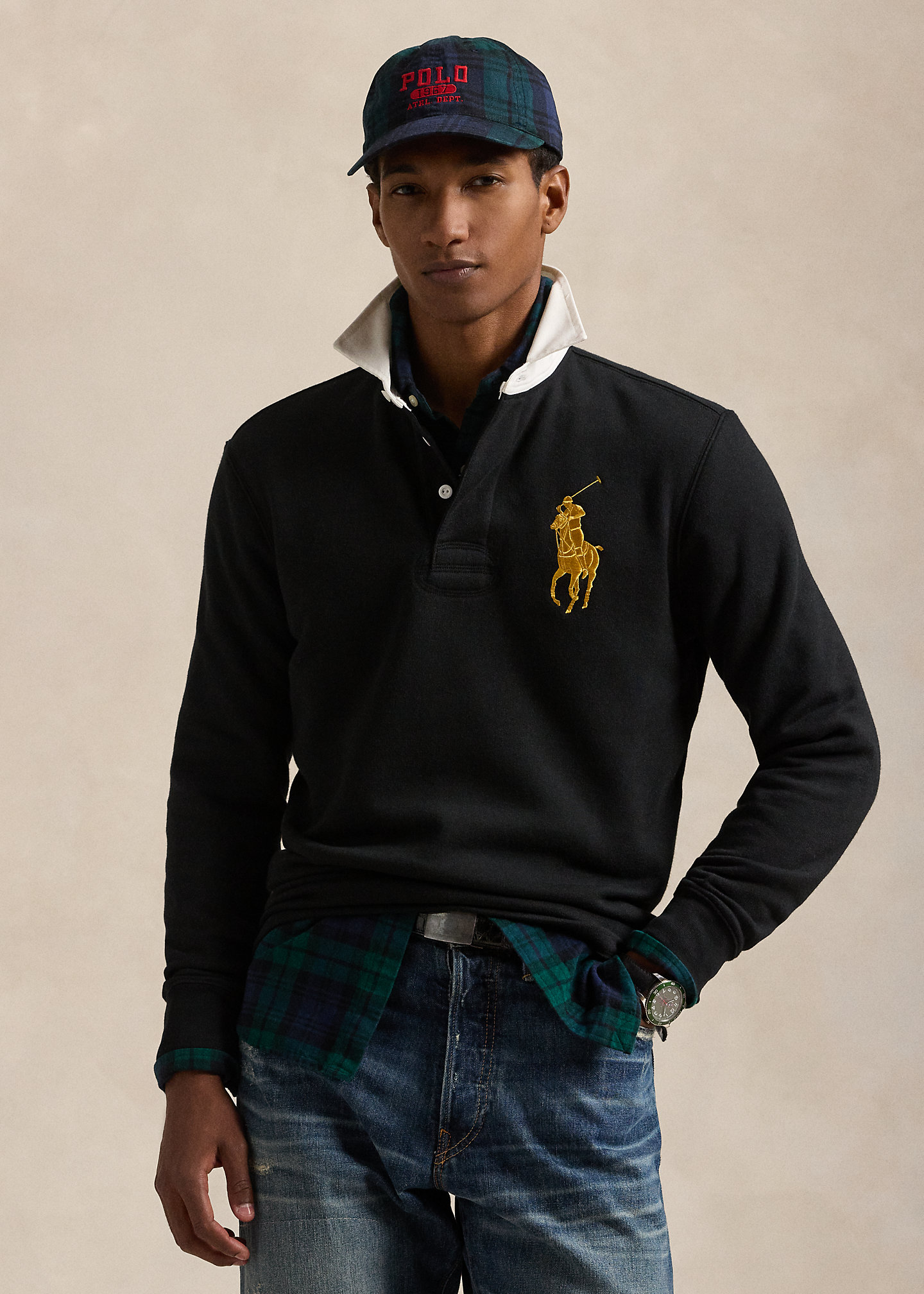 - Twill rugby collar. Three-button placket. Rubber buttons.