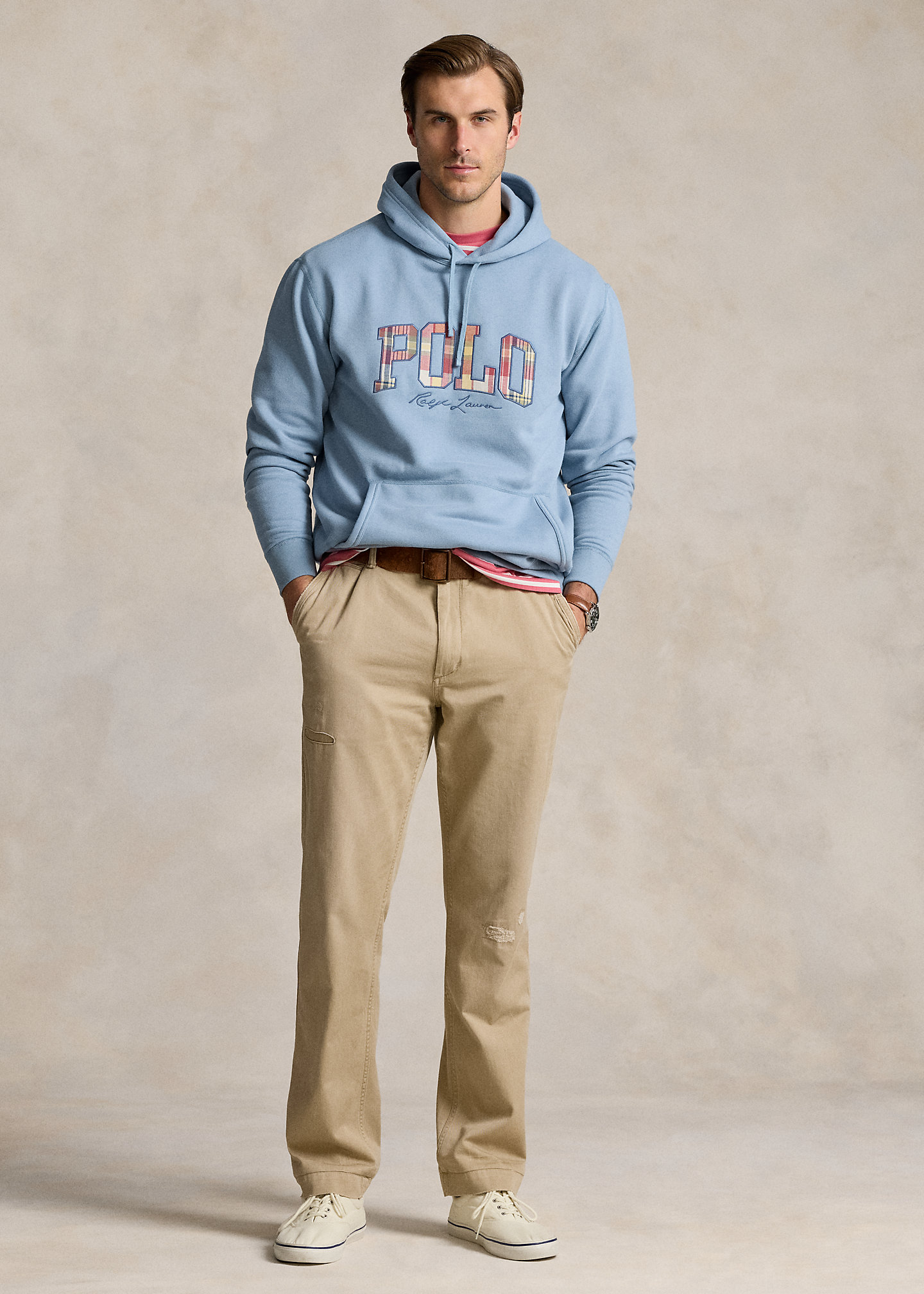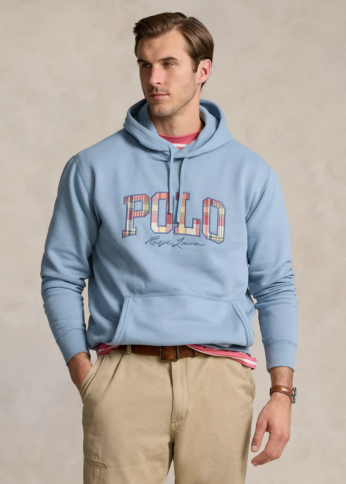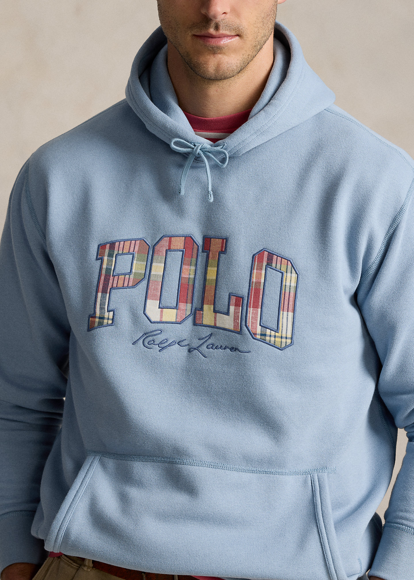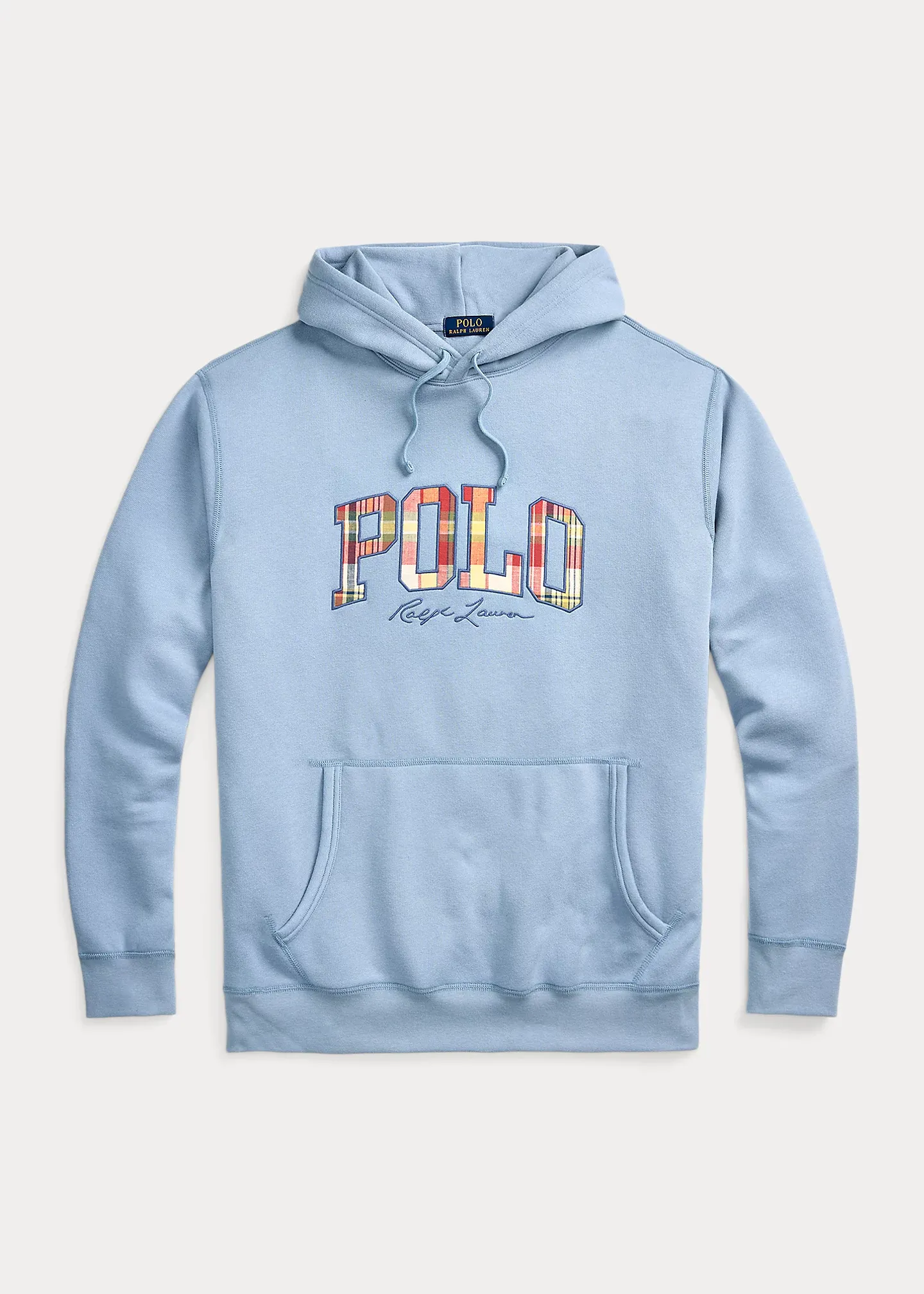 - Plaid appliqués spelling out “Polo” and “Ralph Lauren” script embroidery at the center front.