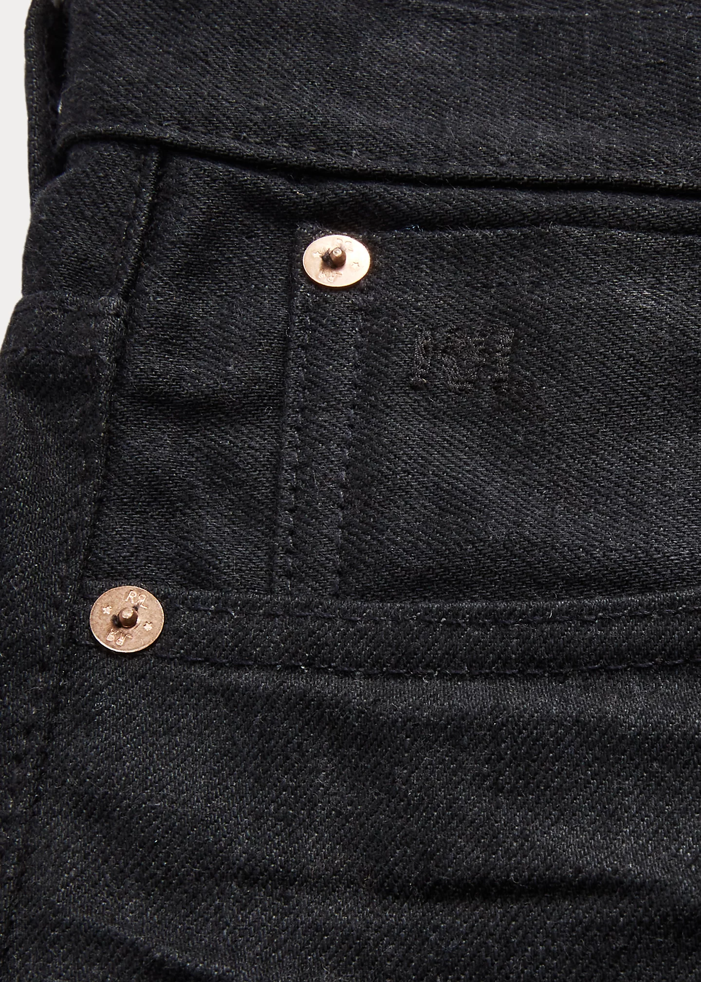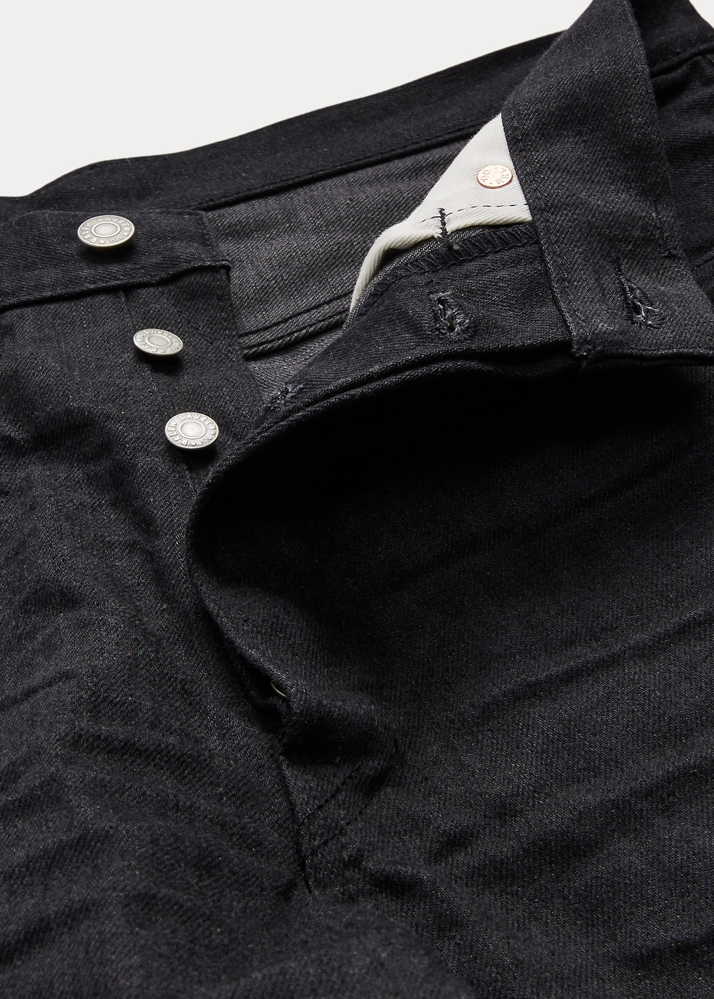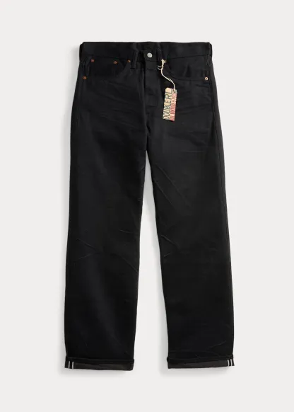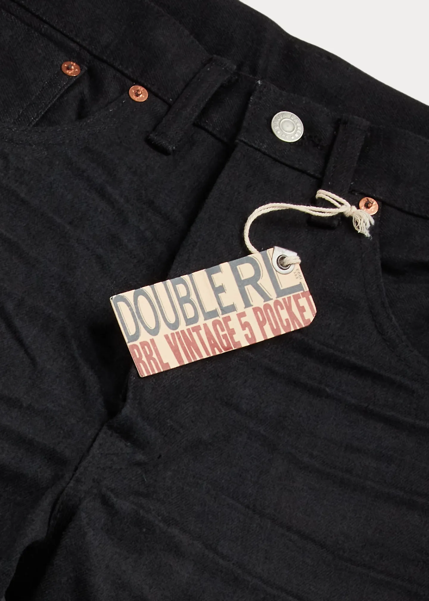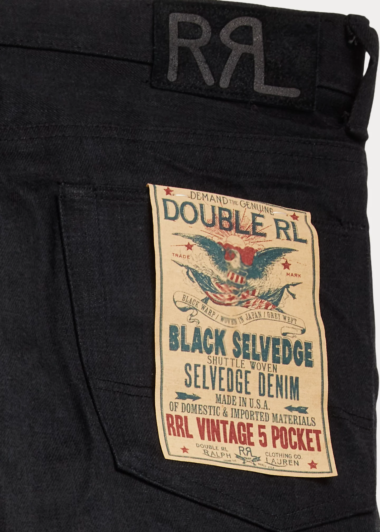 - American-made buttons, copper-tone rivets, and washer burrs. Five-pocket styling. “RRL” embroidery at the selvedge coin pocket. Natural cotton twill pocket lining. Roughout suede “RRL”-debossed logo label at the back right waist.