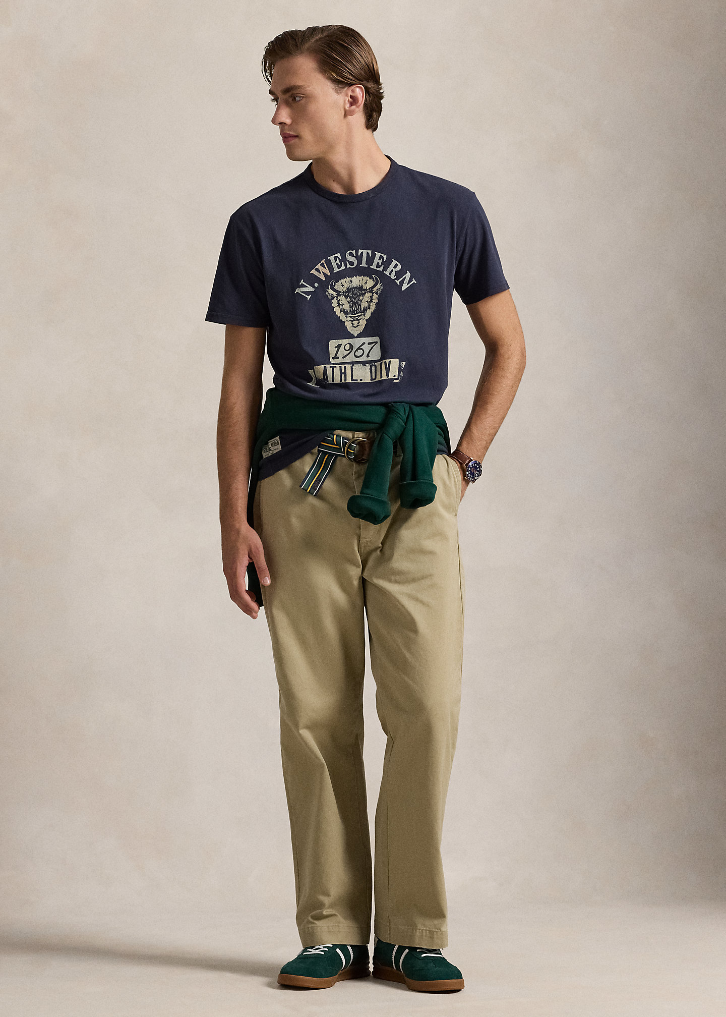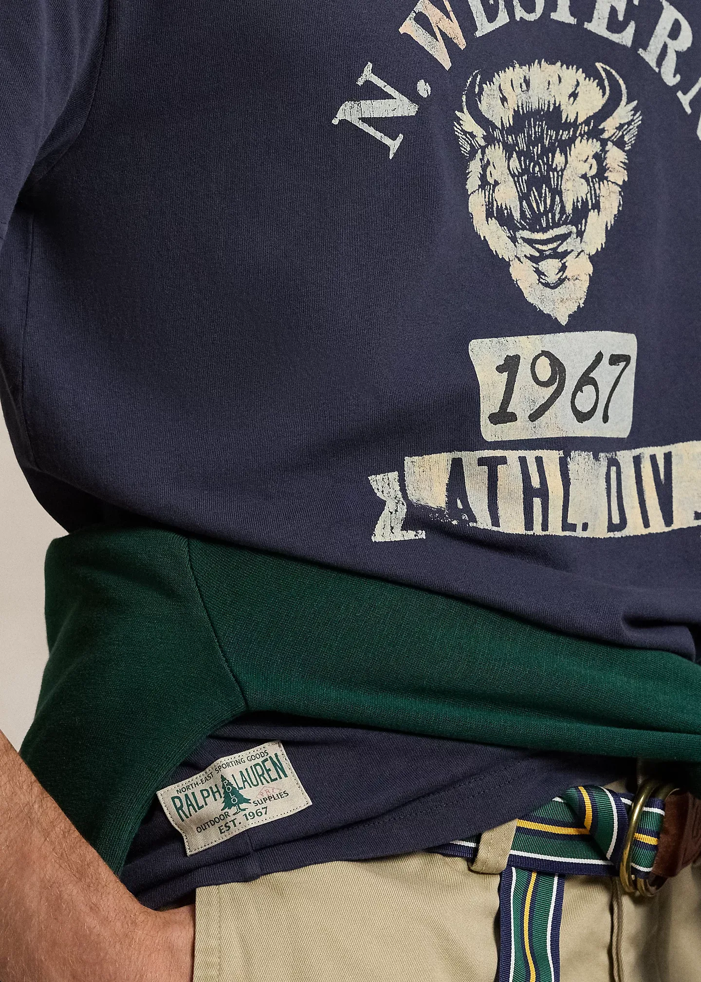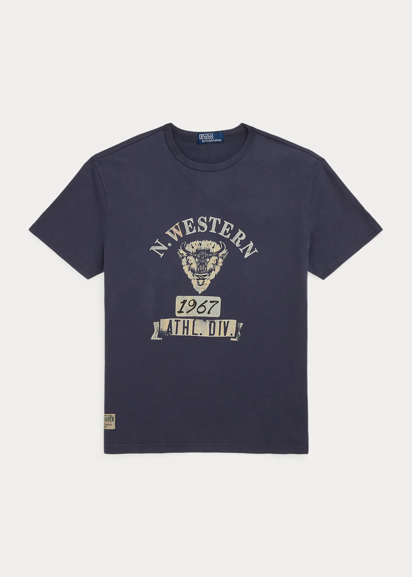 - Crackled "N. Western 1932 Athl. Div." and a buffalo graphic print at the center front. "Ralph Lauren Outdoor Supplies" label at the right side-seam.