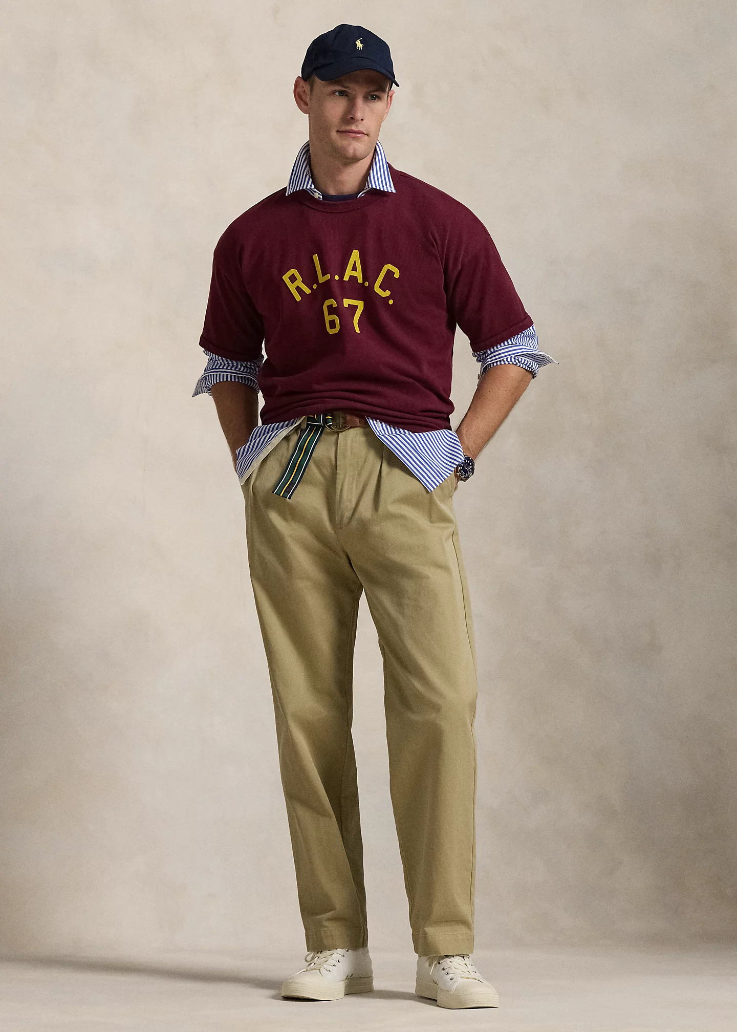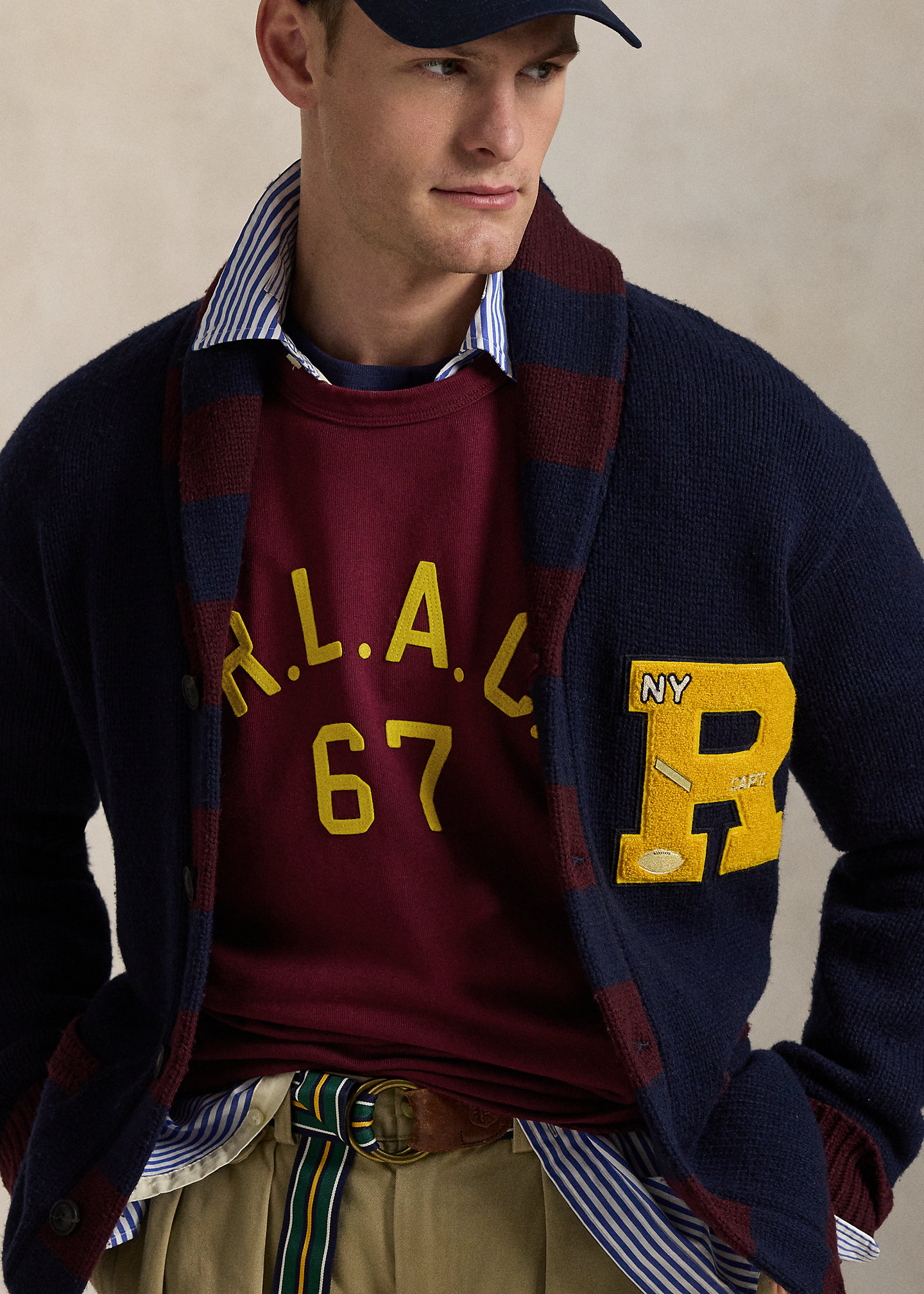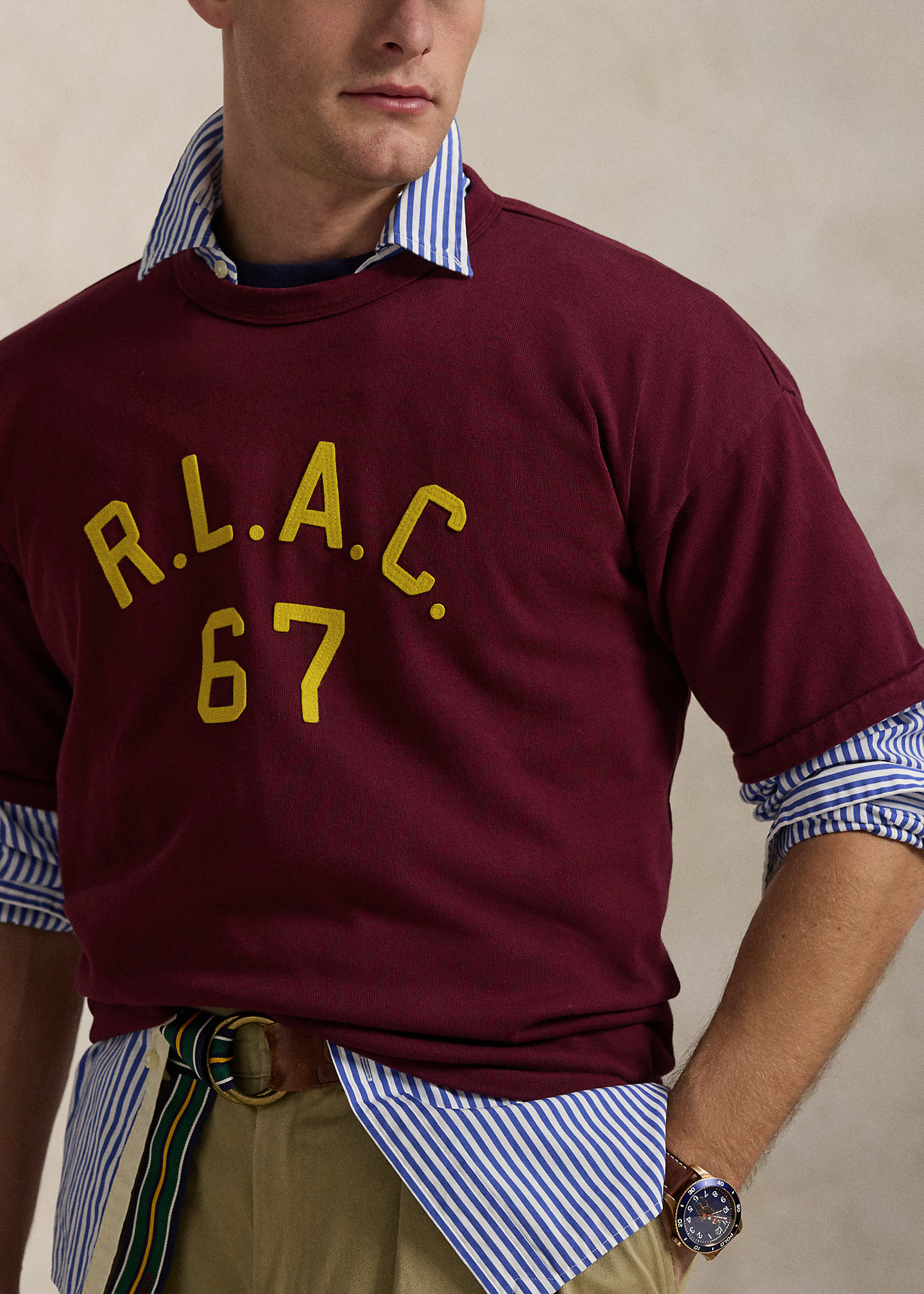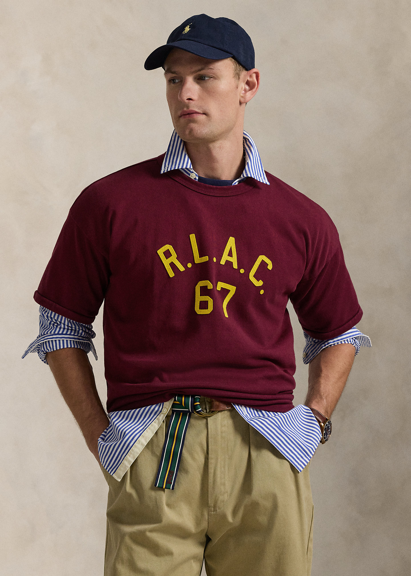 - Felt “R.L.A.C. 67” appliqués at the center front.