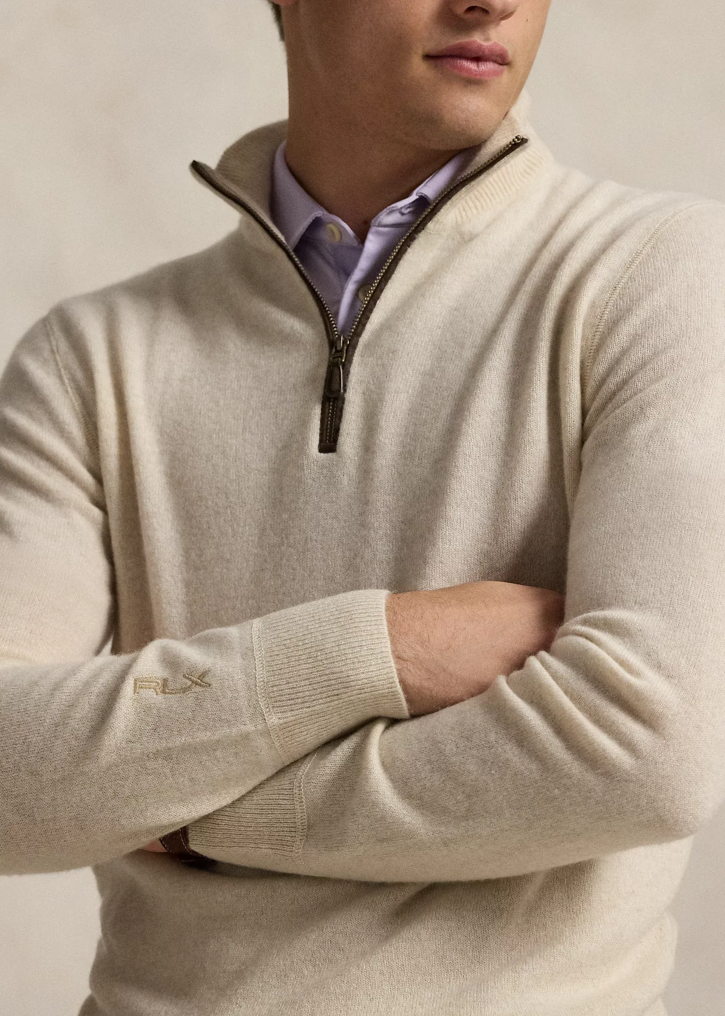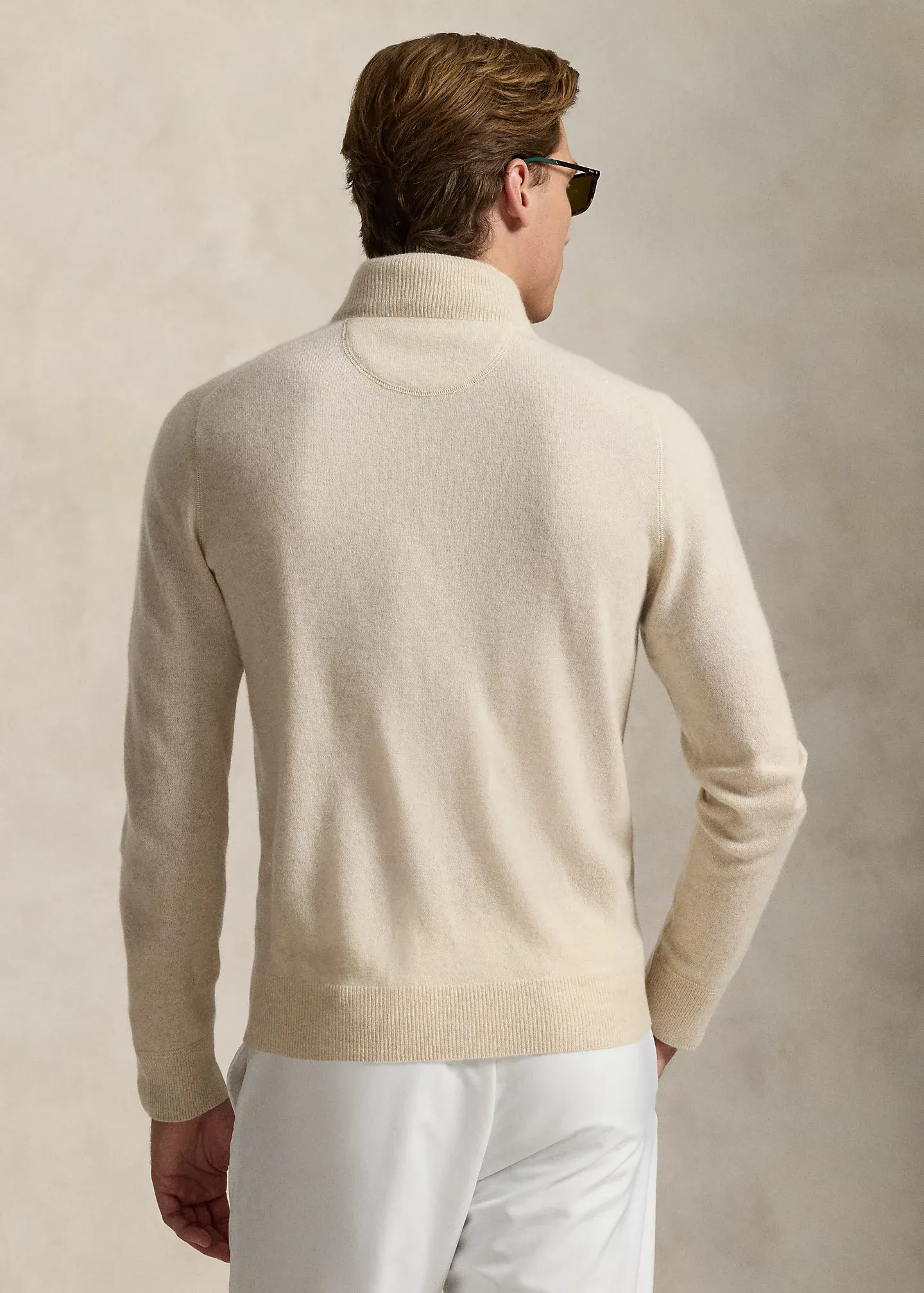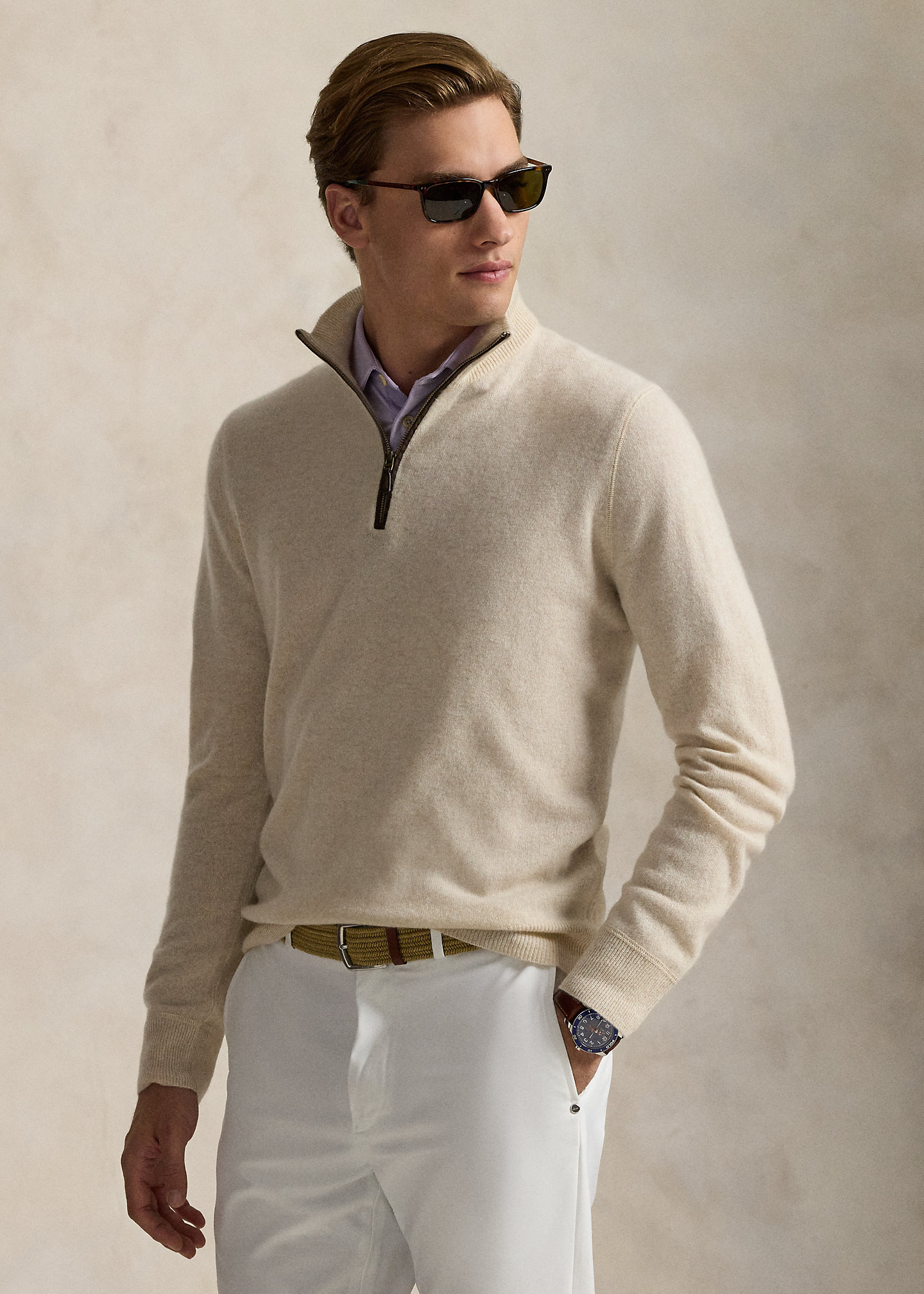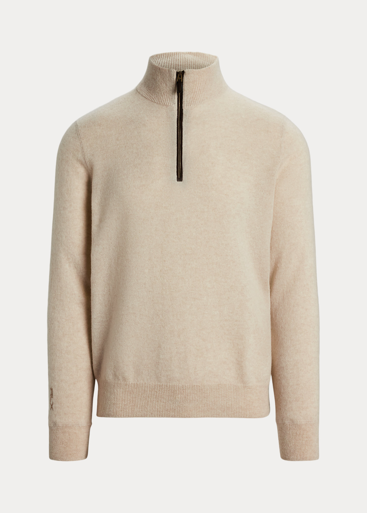 - Rib-knit mockneck. Quarter-zip placket with faux-suede trim. Suede zipper pull.