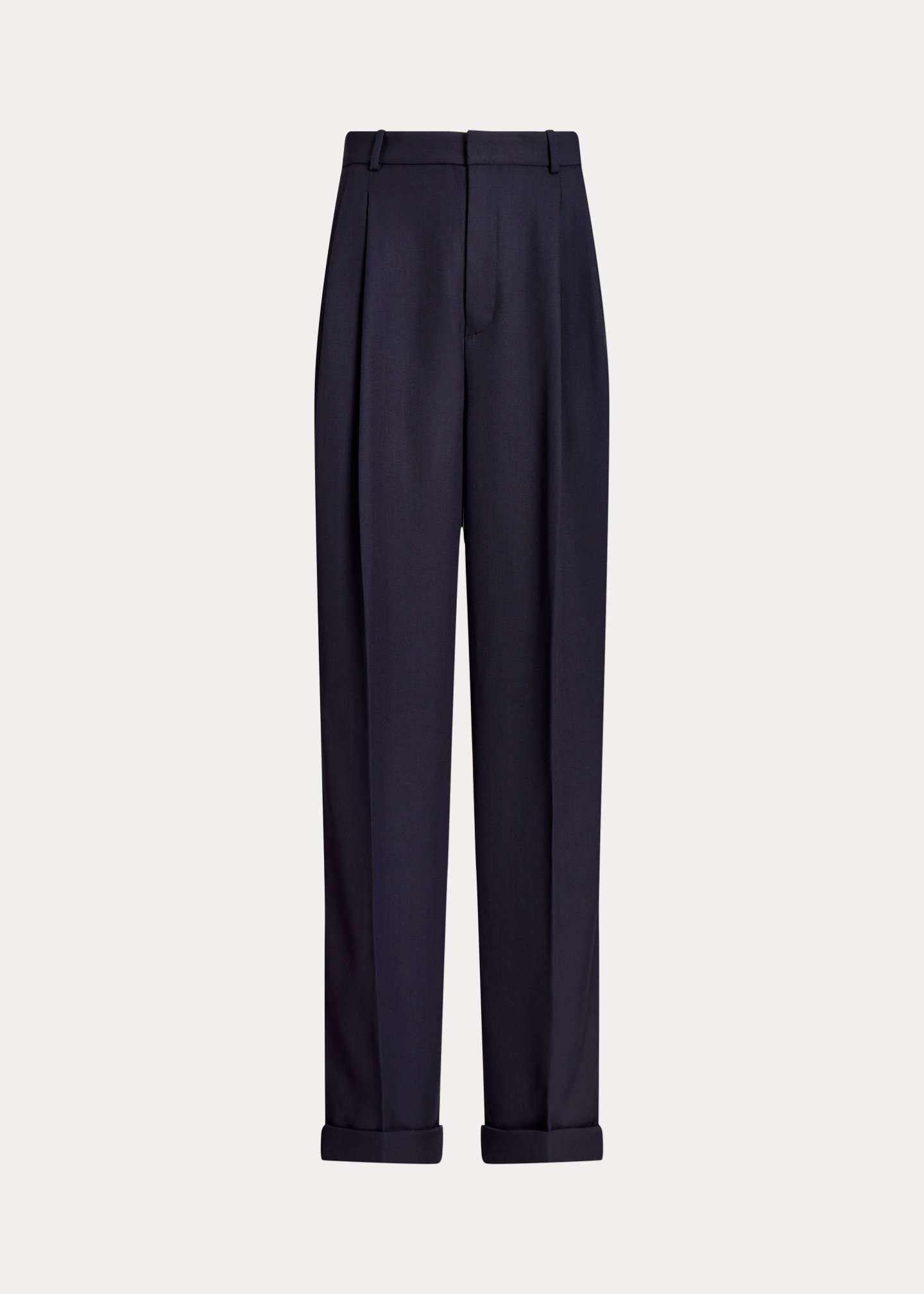 - Pleated front. Back darts. Creases down the front and back of each leg.
